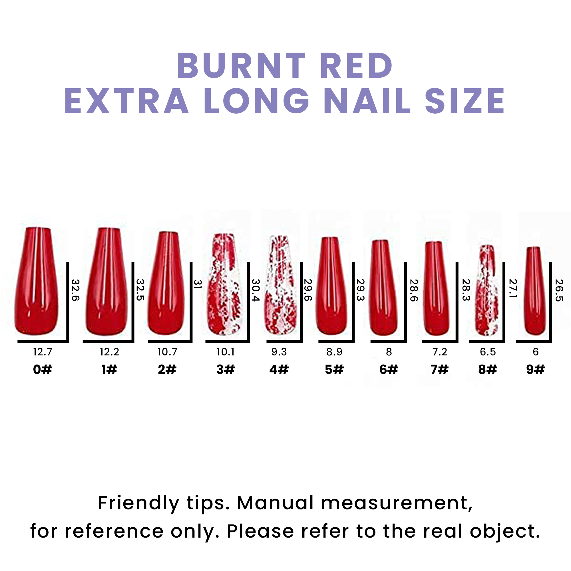 • Our nails come in 10 different Sizes to fit ever nail shape and can be customized and resized  by cutting or filling down the nails. Go on…Treat yourself!!