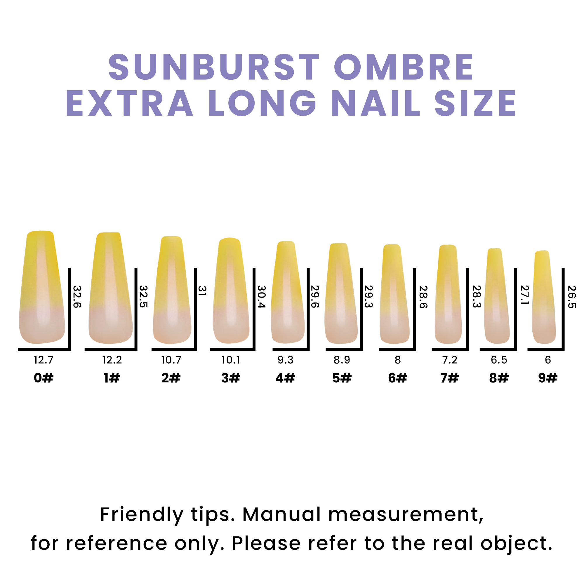 • Our nails come in 10 different Sizes to fit ever nail shape and can be customized and resized  by cutting or filling down the nails. Go on…Treat yourself!!